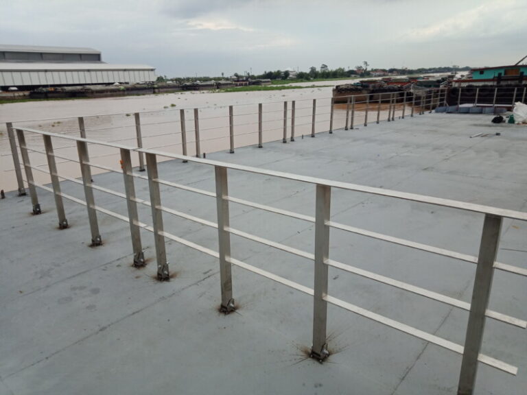 ราวกันตกสแตนเลสบนเรือสำราญ แบบพับได้ พร้อมบันไดวนพื้นเหล็ก แผ่นลาย + ราวกันตกสแตนเลส ความยาวรวม 27.5 เมตร (โดยประมาณ) ผลิต + ติดตั้ง